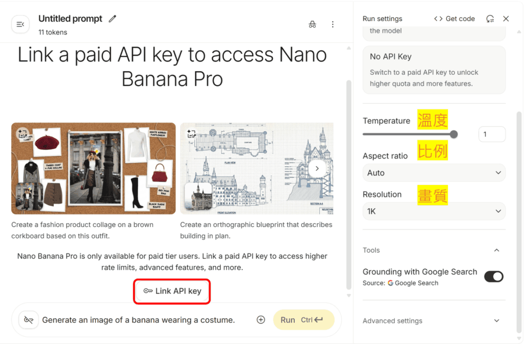 但是必須注意的是,AI Studio的Nano Banana Pro不提供免費使用,需要連結API Key才能付費使用