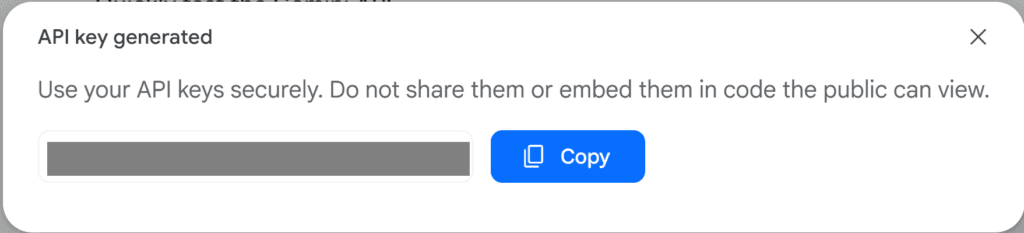 4. 幾秒鐘後,系統就會生成一組 API Key 給你,看到 API Key 後,點擊旁邊的「Copy」按鈕,把這組金鑰複製起來,等等要用到