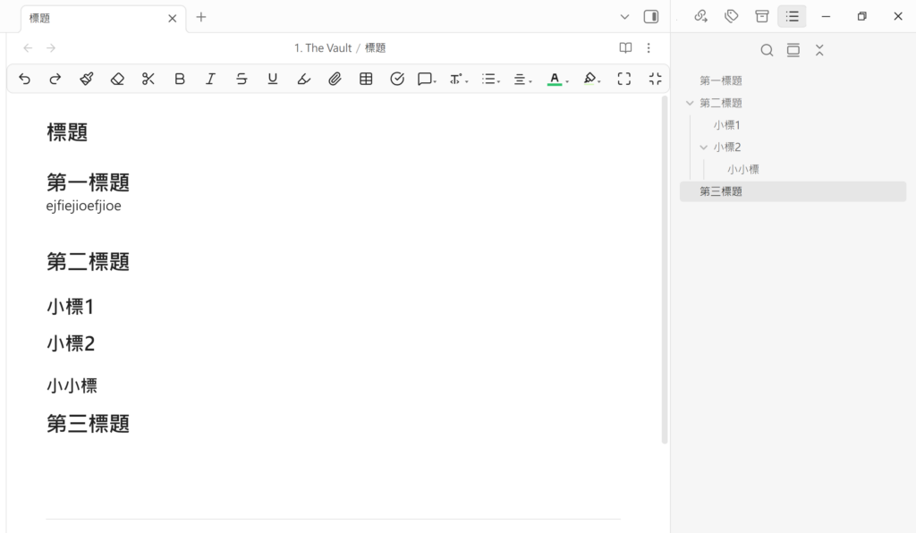 大綱功能會自動抓取筆記中的 H1~H6 標題,生成一個可點擊的側邊目錄