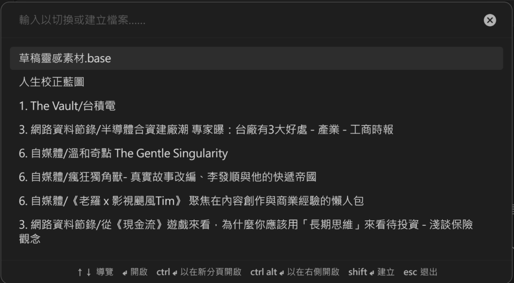 命令面板(Ctrl/Cmd + P)可以想像成 Obsidian 的「萬用指令搜尋」。