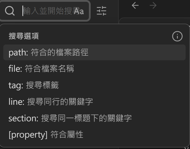 Obsidian 的搜尋功能很強,不只找檔名,也能找內文,還支援: