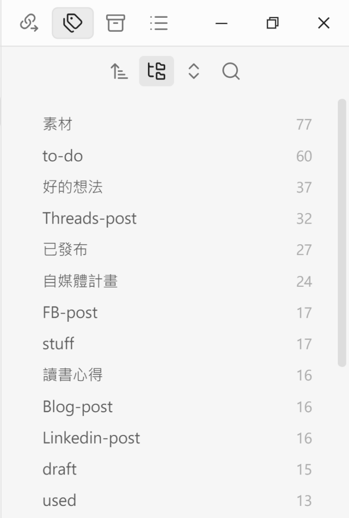 標籤窗格會列出 Vault 中所有的標籤與出現次數,也支援巢狀標籤